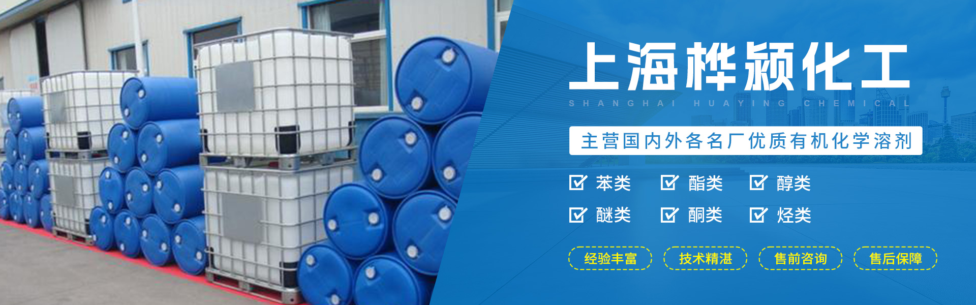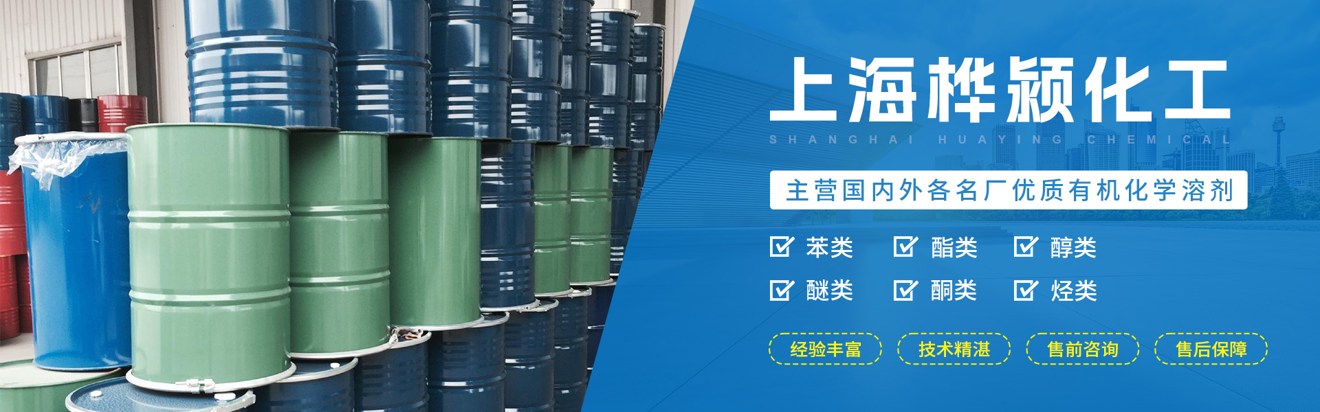 上海桦颍化工有限公司主营国内外各名厂优质有机化学溶剂,包括苯类,酯类,醇类,醚类,酮类,烃类及单体等数十品种进行装分批发零售。